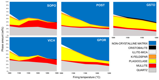VICH and SOPO. For these batches, plagioclase melts quickly up to 1200 °C, with a residual fraction of 8–10% of the starting amount, not preserved at the highest temperatures. Quartz partially dissolves above 1200 °C, but with a slower rate than porcelain stoneware (residual fraction of 70–72% at 1250 °C and 58–63% at 1280 °C). Abundant mullite (up to 20 wt%) stabilizes in the 1100–1200 °C range, then, it undergoes some dissolution–precipitation at the highest temperatures. Due to the latter mechanism, the amount of non-crystalline matrix tends to fluctuate with temperature [40,41], until the maximum content is reached (60–65 wt%).