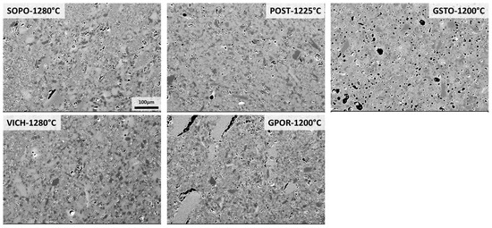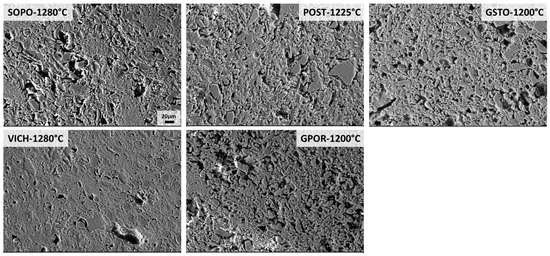 In detail, SOPO, VICH and POST show a lower pores volume, also smaller in size, than that of the other samples, corresponding to a higher bulk density (2.39–2.44 g/cm3) and lower closed porosity (Figure 6, Table S1). GSTO has the lowest degree of densification (2.31 g/cm3) and presents a bimodal distribution of porosity: relatively large, closed pores (~20–30 μm in diameter) together with a series of small pores, smaller than 10 μm. The irregularly shaped pores of larger dimensions that can be observed in GPOR, are presumably due to powder compaction defects [39].