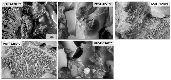 The investigation of mullite was performed at higher magnification, as reported in Figure 8. Different features allow to discriminate SOPO-VICH from POST-GPOR-GSTO, but also between porcelain stoneware bodies. Following the classification proposed by Iqbal and Lee [42,43,44] and extensively adopted in other researches [5,40,45,46,47], it is possible to identify in GPOR and POST the presence of only Type I primary mullite, with small size (always <1 µm) and cuboidal or elongated shape (with low aspect ratio ≤3:1). This type of mullite derives directly from clay relicts and was observed in studies of mullite formation from thermal decomposition of pure kaolinite [48,49]. On the other hand, GSTO also shows the presence of Type II secondary mullite, as grains of ~2 µm, with a higher aspect ratio (on average 8.5:1). Type II mullite originates from regions in which feldspars are well-mixed with kaolinitic clay or where fluxes penetrate clay agglomerates to form needle-shaped crystals, termed secondary mullite since they form later in the firing process [44]. The increase in aspect ratio from Type I to Type II mullite is due to a decrease in the viscosity of the liquid phase. Indeed, the melting of fluxes forms a liquid phase with a lower viscosity than that around pure clay agglomerates, and mullite crystals of neoformation can grow up more easily [42,44,45]. In GSTO, the formation of Type II secondary mullite was possible since the partial replacement of Na-feldspar with soda–lime glass significantly accelerated the sintering process, with an early formation of a non-crystalline phase, which in turn reacted with clay minerals to form secondary mullite [46]. Indeed, at 1000 °C, GSTO shows a content of non-crystalline phase higher than that of other porcelain stoneware bodies (37 wt% vs. 20–27 wt% of POST and GPOR, respectively) which allowed to accelerate the mullite growth. In Figure 8, it can also be seen Type II crystals adjacent to regions of Type I mullite (GSTO). As suggested by Martin Marquez and co-workers [45], the co-presence of both types of mullite may indicate that primary crystals, when formed at the surface of clay agglomerates, could grow out and transform into secondary mullite if close to a matrix with a lower viscosity. This result also agrees with the observation of Lundin [50], who suggested that mullite in clay relicts serves as a seed for the crystallization of mullite needles in feldspar relicts.