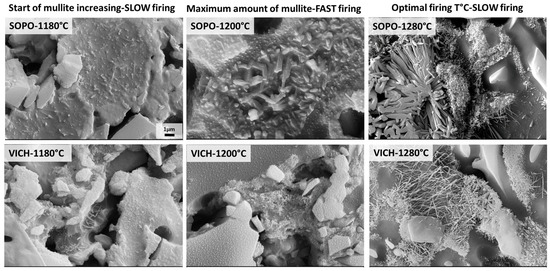 The evolution in shape and size of mullite in porcelain bodies during firing is displayed in Figure 9. Although there is a tiny variation in content (i.e., 19–20 wt% in the 1180–1280 °C range, as detected by the QPA-XRPD analysis), the microstructure of SOPO clearly shows that mullite crystals are experiencing important morphological changes. Conversely, in the same temperature range, VICH is more affected by dissolution–precipitation phenomena of mullite, even if the amount variation of this phase seems not correlated with its morphology. For both porcelain batches, the micrographs at 1180 °C (when a significant increase of mullite takes place) and 1200 °C (when the maximum amount is reached) reveal the presence of Type I primary mullite, even if slightly bigger and thicker in SOPO than in VICH. When the highest temperature is reached and feldspars melt completely, the growth of secondary mullite occurred (both types II and III). It is also worth noting that the firing cycle of porcelain bodies at 1280 °C was performed with a slow cycle of 24 h, which allows for crystal growth, since it is very dependent on the heating rate [45,51]. The variation in size and aspect ratio from Type I to Type III mullite is critical as both strength and toughness of the porcelain increases the more the variation in the aspect ratio is marked [44]. In fact, it has been proved that mullite content affects the mechanical properties of porcelain, being the bending strength directly associated to the aspect ratio of secondary mullite, related to the interlocking of the fine mullite needles [5,45,47]. Moreover, it was observed that the increase in bending strength reaches maximum values when mullite needles join together and give rise to clusters [47], as those detected in SOPO.