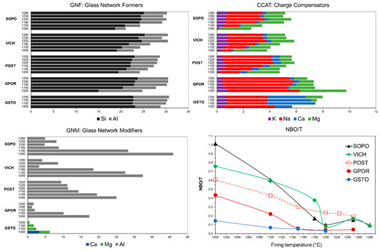 The NBO/T parameter allows following the structural evolution of the melts (Figure 10). GSTO has very low NBO/T values, slightly decreasing with temperature (0.14 → 0.03), i.e., the highest degree of polymerization of the set. GPOR shows a similar behaviour, particularly from 1150 °C onwards, when the significant precipitation of mullite (up to 6.9 wt%) decreases the content of Al3+ as GNM, and the dissolution of quartz increases the content of Si as GNF, making the melt more polymerized (NBO/T ≤ 0.06). Due to the lower formation of mullite (≤4 wt%), GNM keeps quite high in POST, corresponding to less polymerized melts (NBO/T 0.61 → 0.19), with an intermediate trend between porcelain stoneware and porcelain. SOPO and VICH, which have the most de-polymerized melts at the lowest temperatures, then exhibit the most significant drop in NBO/T values (due to the simultaneous mullite crystallization and quartz melting), which yields at 1200 °C quite polymerized melts (NBO/T 0.08–0.10). Subsequent fluctuations are related to the dissolution/precipitation of mullite, which acts as Al3+ buffer in the ceramic bodies.