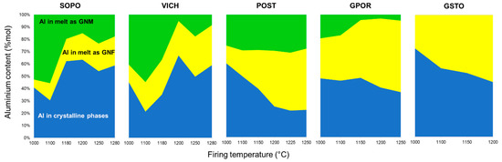 The inspection of the previous pseudo-structural parameters highlights the importance of a detailed investigation of Al3+ speciation, i.e., its partition between crystalline phases and melt in ceramic bodies (Figure 12). For the GSTO and GPOR, Al3+ in melt mainly acts as GNF as it occurs almost exclusively as tetrahedrally coordinated. Only a small fraction of Al3+ in the GPOR melt acts as GNM. This fraction decreases with temperature, being related to the concomitant mullite crystallization. The fraction of Al3+ hosted at tetrahedral and octahedral sites of GSTO and GPOR crystalline phases shows similar trends, but related to different phenomena. The aluminum fraction in the GSTO crystalline phases gradually decreases because of a feldspars slow dissolution. The aluminum fraction in the GPOR crystalline phases decreases even more slowly, since the dissolution of feldspars is in some way counterbalanced by the precipitation of mullite. In POST, the melting of feldspars is not fully compensated by the mullite formation, therefore, as the temperature increases, Al3+ is incorporated into the melt, where it behaves as GNF. The fraction of Al3+ which acts as GNM keeps constant throughout the investigated thermal interval. Porcelains are characterized by less regular trends that reflect the evolution of the crystalline phases with temperature (i.e., melting of feldspars up to 1180–1200 °C and the subsequent crystallization/dissolution of mullite up to 1280 °C). These phases actually represent a repository of aluminium that buffers the release in the melt depending on their stability during firing. As previously discussed (see also Figure 10), the role of Al3+ in the melts of SOPO and VICH is mainly that of a network modifier at the lowest temperatures, then to decrease in correspondence with the formation of mullite.