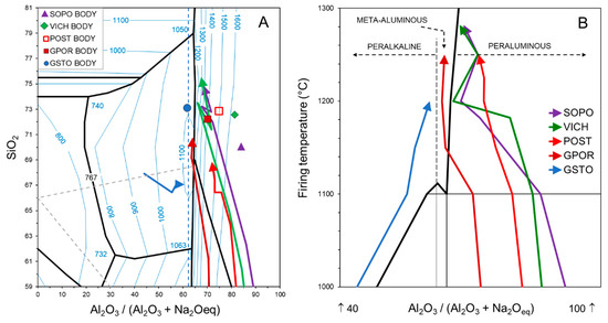 Porcelains have strongly peraluminous bodies, which give rise to strongly peraluminous melts at the lower temperatures, as testified by the high presence of Al3+ as GNM. Then, such melts move rapidly towards the silica vertex and the main cotectic line of the Na2O-Al2O3-SiO2 diagram, due to the simultaneous quartz dissolution and mullite crystallization. As discussed above, trend fluctuations above 1180 °C are those derived from the complex behavior of mullite. POST also has a strongly peraluminous body and, indeed, the trend defined by the melt chemical variation approaches that of porcelain, with a composition more and more enriched in silica due to the quartz melting. However, it keeps a frankly peraluminous composition also at the highest temperatures, due to the scarce mullite formation. Otherwise, the frankly peraluminous GPOR body produces a slightly peraluminous melt at low temperatures, which moves quickly to the cotectic line, reaching the meta-aluminous field. The glass-bearing stoneware has a meta-aluminous body, evolving in melts which keep their composition in the peralkaline field, moving towards the cotectic line by increasing temperature and finally approaching the meta-aluminous line again. Indeed, GSTO is quite close to the feldspar stoichiometry and this justifies the stability of plagioclase at all firing conditions (Figure 4, Table S3). At temperature >1150 °C, GPOR is the closest to a thermodynamic equilibrium, as the melt composition evolves along the liquidus surface near the isotherm of 1200 °C.