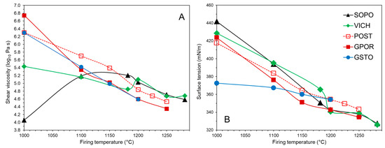 Shear viscosity (A) and gas–liquid surface (B) of the melts vs. firing temperature.