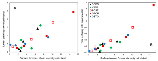 The surface tension to shear viscosity ratio is the fundamental term in the equations used to describe the viscous flow sintering kinetics in glasses, as those of the Frenkel and Mackenzie–Shuttleworth models [54]: the higher the ratio, the faster the expected densification rate. This parameter, already successfully used to describe the sintering kinetics in porcelain stoneware bodies [23,29], is here calculated and contrasted with the experimental linear and total rates, as derived from the HSM isothermal tests (Figure 15).