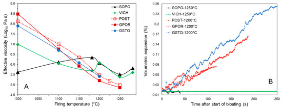 Effective viscosity vs. firing T °C (A) and bloating degree (B).