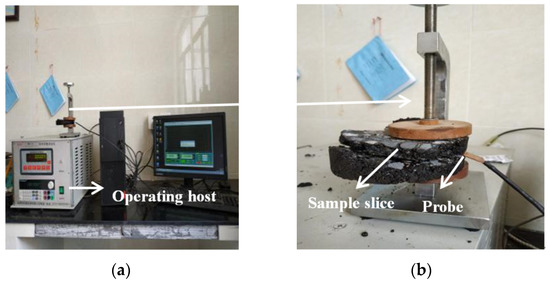 Each Marshall specimen was cut into several slices with smooth surfaces. A DRE-2C thermal conductivity instrument (Xiangtan Instruments and Meters, Xiangtan, China), which is based on the transient plane heat source method, was used to measure the thermal conductivity (Figure 4a,b). In the test process, a test probe was placed between two sample slices and the two slices were closely connected. The measuring sensor acted both as a temperature sensor for recording the increase of time-dependent temperature and as a heat source to heat the sample of asphalt mixture slices during the test process. Equation (3) allows calculating for the thermal conductivity () whose values of asphalt concrete varied from 1.55 to 2.06 W/(m·K) [4].