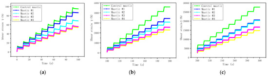 The MSCR test was performed to evaluate the rutting resistance of different asphalt mastics. Figure 9a–c show the shear strain variations with time at different stress levels (i.e., 0.1 kPa, 3.2 kPa, and 12.8 kPa, respectively).