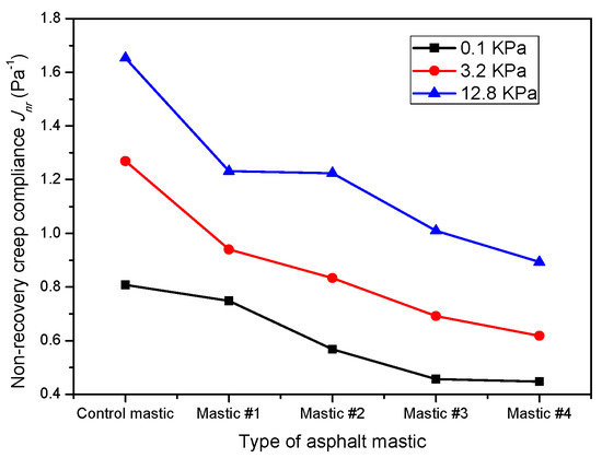 Figure 10 shows that the non-recovery creep compliances of all the asphalt mastics increased with increasing applied stress levels, which was consistent with [44,45]. At the stress level 3.2 kPa, Jnr of the control mastic was 1.28 kPa−1 and satisfied the heavy (H) level of traffic loading according to AASHTO MP 19-10. Meanwhile, Jnr of mastic #4 was 0.62 kPa−1 and satisfied the very heavy (V) level of traffic loading. The comparison between Jnr values highlights that HMF had a lower ability to increase Jnr of asphalt than LMF. That is, HMF could better improve the deformation resistance of asphalt than LMF. Specifically, at the stress level 12.8 kPa, the Jnr,12.8 values of Mastic #1, #2, #3, and #4 were 25.5%, 25.9%, 39.0%, and 45.9% lower than those of the control mastic, respectively.