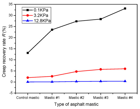 The results in Figure 10 and Figure 11 reveal that stress level had a higher influence on R compared with Jnr. At the stress level of 12.8 kPa, the R of all mastics was nearly equal to 0 and confirmed [46,47,48]. These low R values were related to the considerable strain caused by the high stress [42]. On the other hand, the filler type had an obvious influence on the R at 0.1 kPa and 3.2 kPa stress levels. For example, the R of the control mastic at the stress level of 3.2 kPa was 23.0%, 58.1%, 65.4%, and 67.0% lower than that of Mastic #1, #2, #3, and #4. By contrast, at the stress level of 12.8 kPa, the R of all the asphalt mastics changed in a very small range, indicating that at this stress level, the powder type does not affect the creep recovery rate.