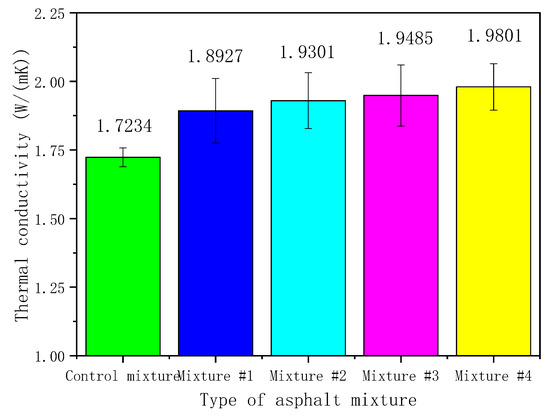 To present the influence of HMF on the heat-transfer characteristic of asphalt pavement, the thermal conductivities of asphalt mixtures with different powders were measured. Figure 12 shows the results. Error bars in Table 6 are also marked to present the measurement uncertainties of tests, according to Equations (1) and (2).