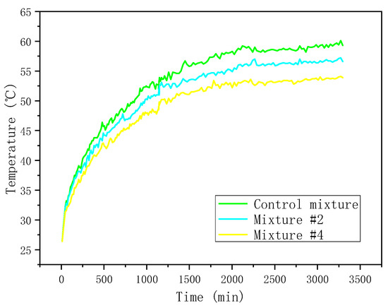 To avoid the difference of temperature distribution being too small to be observed, the control asphalt mixture, Mixture #2, and Mixture #4 with 0%, 50%, and 100% HMF were selected. Figure 13 shows the results.