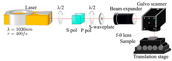 Femtosecond laser engraving is performed using the setup depicted in Figure 1. Here, a femtosecond laser “Tangor HP” from amplitude lasers with a wavelength nm pulse duration fs and pulse repetition rate kHz has been employed. The laser beam passes through a half wave plate and a polarizer cube to control laser fluence and then a s-wave-plate (Altechna) to achieve CV beams, then through a beam expander to control the final laser diameter. Then, the shaped beam passes through the galvanometer scanner. A lens (Ronar-Smith, Winsen, Germany) with f = 170 mm is used to focus the laser beam.
