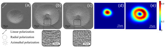 SEM micrographs of impacts on stainless-steel produced by linear Gaussian beam (a), azimuthal (b), and radial (c) polarized doughnut beams at arbitrary pulse energy. They are showing LIPSS perpendicular to polarization direction. Beam profile at focal plane of Gaussian beam (d) and doughnut profile with azimuthal and radial polarizations (e).