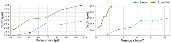 Depth variation as a function of the pulse energy (right) and fluence (left) of inscribed lines for Gaussian linear polarization and CV azimuthal polarization at 1 mm/s. Lines inscribed with linear polarization exhibit consistently lower depth than the ones inscribed with azimuthal polarization. The bold data points representing identical accumulated fluence.