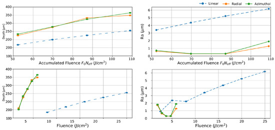 where kx is the number of pulses per line and ky is the number of lines. An overlap ratio of has been chosen as based on previous studies of process optimization using Gaussian laser beams [18]. Applying Equation (4), . Keeping same scan speed, the larger beam area of CV beams shifts the overlap ratio to and using Equations (5) and (6) the new effective pulse number is . The accumulated fluence (or accumulated dose) can be defined as . Therefore, when scanning speed is kept constant, the pulse energy must be adapted in order to achieve identical accumulated fluence by a ratio . This value is very close to unity, which implies that it is similar to a same average power situation for both beam types.