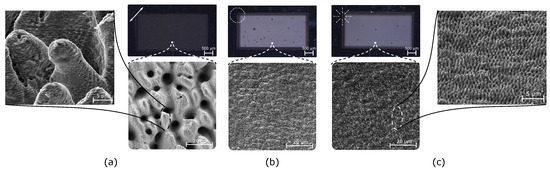 Optic microscope (top) and zoomed SEM micrographs (bottom) of engraved stainless-steel rectangles at 1 m/s scan speed at 51.3 µJ and 100 kHz for: linear Gaussian (a), and CV with azimuthal (b) and radial (c) polarizations.