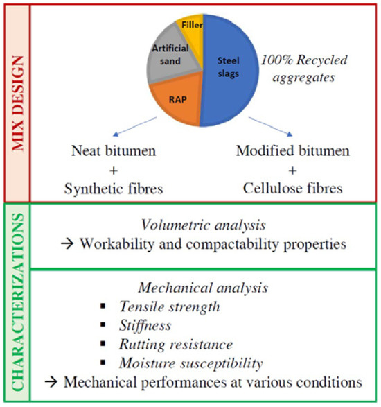 The aim of this study is to design a bituminous mixture, with a low voids content, for a thin hot mix asphalt overlay with 100% recycled aggregates. The use of sustainable materials in TAO mixes proved to be advantageous for the proper maintenance of road pavement surfaces in the presence of minor deteriorations. The novelty of the present study is the use of bituminous mixtures consisting of 100% recycled aggregates, allowing performances comparable to those of traditional hot asphalt mixtures. The recycled aggregates used are RAP, reclaimed municipal solid waste incinerator (MSWI) sand and steel furnace slags. Two types of bitumen were considered: a standard bitumen with a penetration value of 50/70 and an SBS-modified bitumen. In addition, cellulose fibres were added to the mix containing PmB, while innovative synthetic fibres were included in the mixtures with neat bitumen. Thanks to a preliminary mix design, the optimum binder content and the aggregates gradation of the recycled mixtures were defined. The two different TAO mixes were produced and compared in terms of volumetric and mechanical properties in order to evaluate the possible use of these fully recycled mixtures as sustainable maintenance treatment. The experimental programme of this study is visually summarized in Figure 1.
