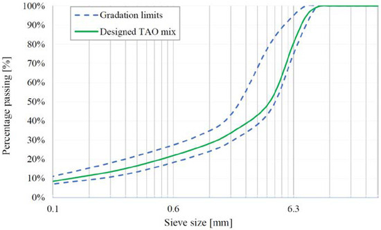 Traditional limestone filler with a diameter lower than 0.063 mm was introduced to complete the aggregate gradation of the TAO mixes, thus meeting the specification of the EN 13108-2 standard.