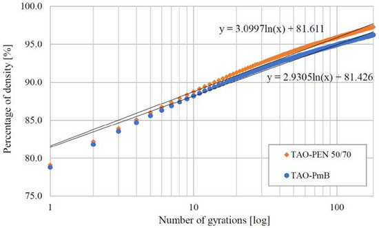 where %ρm is the percentage of maximum densification, a is the slope of the compaction curve, x is the number of gyrations and b is the intercept of the regression curve. Figure 4 shows the compaction curves of the two recycled TAO mixtures, while Table 4 lists the coefficients used in the Equation (1) and the air voids contents (Va) at three different numbers of gyrations.