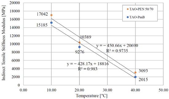 Figure 5 clearly shows the higher stiffness of the mixture produced with neat bitumen and synthetic fibres at every test temperature. In accordance with the previous static mechanical analysis, the incorporation of aramid–polyolefin fibres allowed the enhancement of the asphalt properties under every condition. This further confirmed the achievement of high mechanical properties with the combined use of neat bitumen and synthetic fibres. The obtained ITSM values for TAO–PEN 50/70 were comparable and even higher than the stiffness of the TAO–PmB. Overall, the ITSM values of both mixtures satisfied the referenced Italian technical specifications.