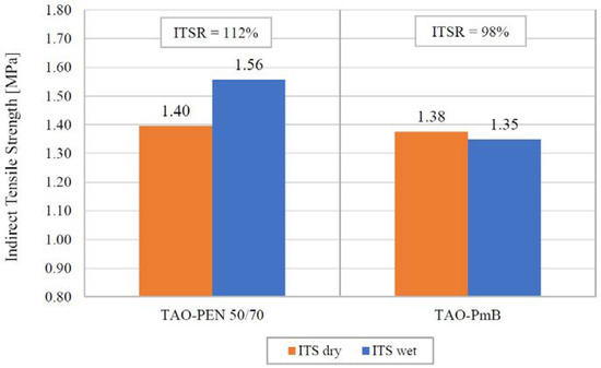The moisture susceptibility of the TAO mixes was evaluated by comparing the ITS values of dry and wet conditioned samples. Six samples per each TAO mix were subjected to conditioning and ITS testing according to the EN 12697-12 standard. The average ITS results of the recycled TAO mixes after dry and wet conditioning are reported in Figure 6, which includes the corresponding ITSR results.