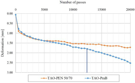 Rut depth of TAO–PEN 50/70 and TAO–PmB obtained from Hamburg wheel track test.