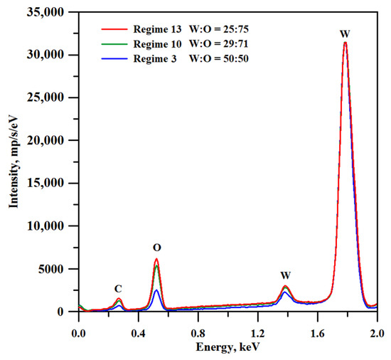 EDS spectra of tungsten samples textured with different laser treatment regimes. Note that the spectra were recorded for the samples prior to hydrophobization.