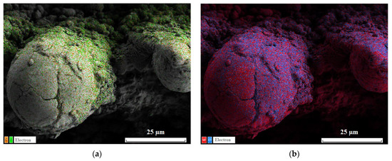 EDS elemental maps for the distribution of (a) carbon (orange dots) and fluorine (green); (b) tungsten (red) and oxygen (blue) on the surface of superhydrophobic tungsten sample obtained by regime 13 after 10 h of oscillated sand abrasion test.