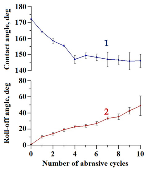 Figure 1 shows the variation of contact and roll-off angles with a time of oscillated sand abrasive load. During the first hour of sand abrasion, the contact angle decreased to ~166° but then the deterioration slowed down, and after 10 h of oscillated abrasive load, the contact angle only reduced to 157° while the roll-off angle increased to 15°. Thus, the sample retained the superhydrophobic properties, although being somewhat degraded.