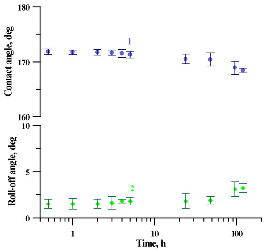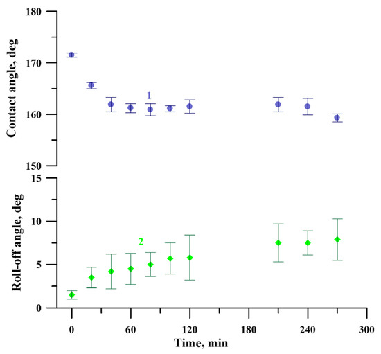 The variation of contact (1) and roll-off (2) angles of a water droplet with the time of the cavitation load for the superhydrophobic coating on the tungsten surface obtained by regime 13.