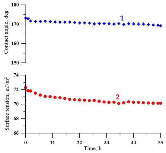 The variation of contact angle (1) and surface tension (2) of a water droplet at prolonged contact with the superhydrophobic coating on the tungsten surface obtained by regime 13.