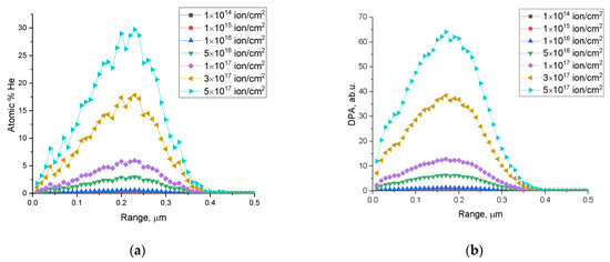 Calculation results for the dependences of (a) the concentration of implanted He2+ and (b) atomic displacements along the trajectory of incident particles for various irradiation fluences.