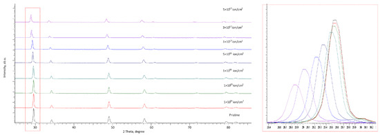 X-ray diffraction patterns of the studied samples depending on the irradiation fluence (the highlighted area reflects changes in the position and shape of the diffraction reflection at 2θ = 29–30°).