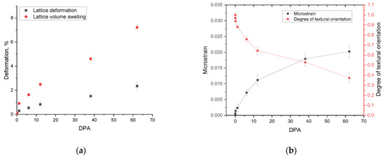 (a) Evaluation results of the crystal lattice deformation and swelling; (b) results of changes in microstresses and textural orientation as a function of the dose of atomic displacements.