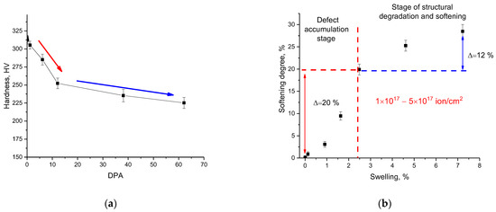 (a) Results of changes in the microhardness value depending on the value of atomic displacements; (b) results of the near-surface layer softening depending on the swelling degree.