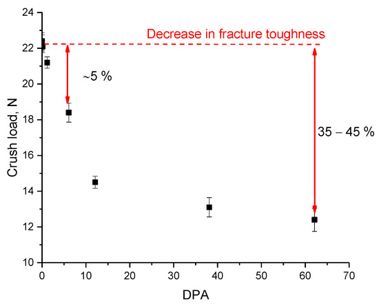 Figure 5 shows the results of the determination of the crack resistance during a single compression of samples exposed to irradiation. According to the data obtained, the crack resistance is preserved at small atomic displacements, which are characterized by the dominance of the formation of point defects and their accumulation. In the case when swelling processes begin to dominate in the structure, crack resistance is significantly reduced, which may be due to processes associated with the formation of gas-filled bubbles, leading to accelerated propagation of microcracks with an increase in the volume of filled cavities, thereby increasing the degree of stress and increasing the likelihood of embrittlement or cracking under external influences.