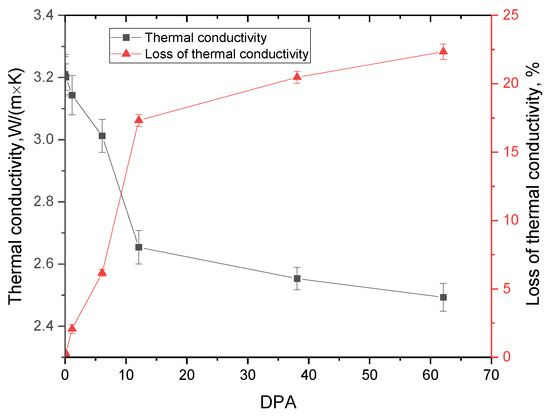 Figure 6 shows the data on changes in the values of the thermophysical parameters of the ceramics under study depending on the accumulated value of atomic displacements in the near-surface layer, which reflects the deterioration of the thermal conductivity of the ceramics. The effect of reduction in the thermal conductivity decrease and an increase in heat losses at high fluences and atomic displacements was also established in [43,44] when the ceramic materials were irradiated with neutron radiation.