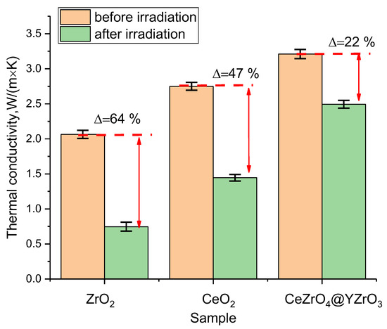 As can be seen from the data presented, a change in the composition of ceramics from single-phase ZrO2 or CeO2 to two-phase CeZrO4–YZrO3 leads to an increase in thermal conductivity from 2.02–2.75 W/m×K to 3.2 W/m×K, which indicates an improvement in thermophysical parameters due to a change in the phase composition of ceramics. At the same time, as can be seen from evaluation results of the change in the thermal conductivity coefficient for the samples under study after irradiation, the maximum decrease of more than 60% was observed for ZrO2, for which, as is known from several works [29,30], processes of polymorphic transformations of the t-ZrO2 → c-ZrO2 type are observed during irradiation, which are accompanied by a change in thermophysical and strength parameters. At the same time, comparing the results of changes in the thermal conductivity of ZrO2 and CeZrO4–YZrO3 samples, it was found that in the case of CeZrO4–YZrO3 ceramics, the presence of two-phase leads to a threefold increase in resistance to a decrease in thermophysical parameters, which indicates excellent prospects for the use of these types of ceramics as inert matrix materials.