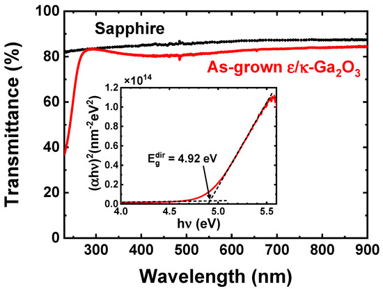 - Oda, M.; Kaneko, K.; Fujita, S.; Hitora, T. Crack-free thick (∼5 µm) α-Ga2O3 films on sapphire substrates with α-(Al,Ga)2O3 buffer layers. Jpn. J. Appl. Phys. 2016, 55, 1202B4. [Google Scholar] [CrossRef]
