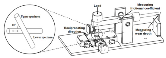 The tribological performance of stainless-steel wire was tested via metal-wire reciprocating friction testing machine. The testing machine is shown in Figure 1. The lower specimen is mounted on the workbench by the fixture and driven by the motor along with the workbench for linear reciprocating motion. Driven by adjustable motor, the workbench can realize the reciprocating motion of different strokes and speeds. The upper specimen is fixed on the vertical rod by bolt and kept static; adjusting the fixed angle can change the crossing angle of the upper and lower specimens, and the contact loads are provided by the weight placed on the vertical rod. In the experiment, the lower and upper specimens are both 316L stainless-steel wire. In the process of reciprocating movement, the friction force is obtained by measuring the deformation of horizontal beam through a strain gauge. The changes in wear depth drive the vertical displacement of the horizontal beam, then the wear depth can be collected by the displacement sensor at the end of the horizontal beam.