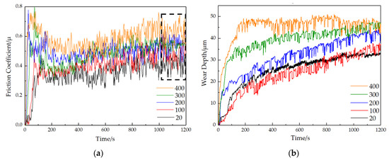 After entering the stable wear stage, for each certain temperature, the friction coefficient still has an upward tendency, but the increasing speed decreases compared with that in the unstable wear stage, and temperature almost has no effect on the increasing speed. In the stable wear stage, the rising rate of wear depth is lower than that in the unstable wear stage under the same temperature, and this difference gradually increases with increasing temperature. As the temperature rises over 300 °C, in the stable wear stage, the rising rate of wear depth is significantly lower than that at 20~200 °C. The average values of the friction coefficient (about the last 200s, as shown in Figure 2a) and wear depth at the stable wear stage were further obtained, as shown in Table 3. According to the results, an increase in both paraments with increasing temperature can be found. Specifically, the friction coefficient increases from 0.415 at 20 °C to 0.635 at 400 °C. The wear depth increases from 34 μm at 20 °C to 51 μm at 400 °C.