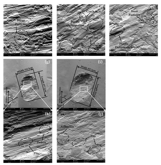 The SEM images of worn surface under 10 N to 20 N at 20 °C, 200 °C, and 400 °C in group 2 are shown in Figure 6. When the temperature is 20 °C, with the load rising, there are more compacted areas and less grooves in the surface area (Figure 6a,d,h), proving that the severity of adhesive wear increases and abrasive wear decreases with increasing load.