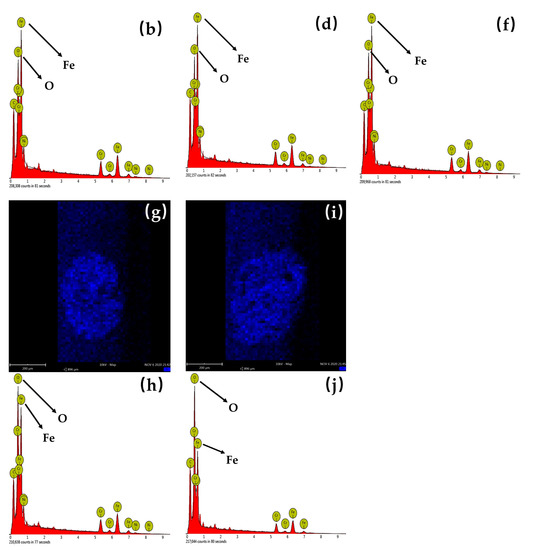 EDS of worn surface and EDS of oxygen distribution of 20~400 °C in group 1: (a,b) 20 °C; (c,d) 100 °C; (e,f) 200 °C; (g,h) 300 °C; (i,j) 400 °C.