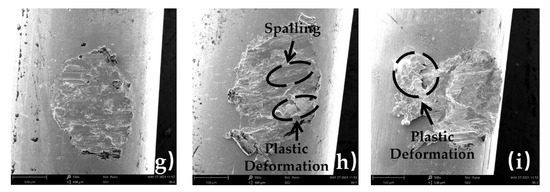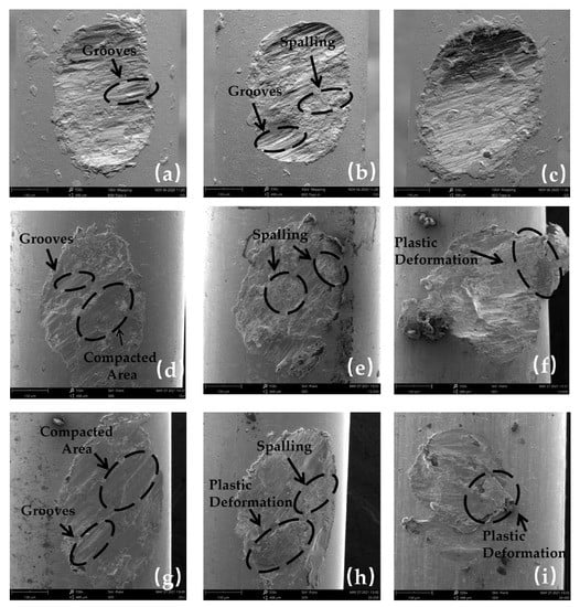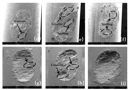 SEM images of worn surface under different strokes and temperatures: (a) 20 °C—0.4 mm; (b) 200 °C—0.4 mm; (c) 400 °C—0.4 mm; (d) 20 °C—0.6 mm; (e) 200 °C—0.6 mm; (f) 400 °C—0.6 mm; (g) 20 °C—0.8 mm; (h) 200 °C—0.8 mm; (i) 400 °C—0.8 mm.