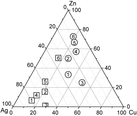 Ternary composition plot for the starting solutions (circles) and obtained samples (squares). Equal numbers denote the compositions for the initial solutions, as well as the samples of zeolites obtained using ion exchange treatment in these solutions: 1—stands for Ag1Cu1Zn1Mor, 2—for Ag1Cu1Zn2Mor, 3—for Ag1Cu2Zn1Mor, 4—for Ag1Cu2Zn4Mor, 5—for Ag1Cu2Zn6Mor, and 6—for Ag1Cu2Zn8Mor.