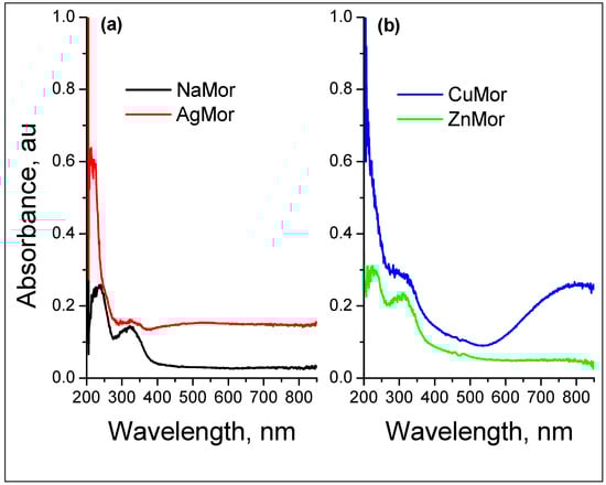 The UV-Vis spectrum (Figure 2) of the exchanged CuMor sample shows a characteristic band of the Cu2+ cation, centered at 800–850 nm, and a charge-transfer band at ~210 nm due to the interaction of the Cu2+ cations with the oxygen of the zeolite framework. The Ag+ and Zn2+ cations themselves do not have characteristic absorbance in the UV-Vis range. However, similarly to Cu2+, these last two cations interact with the zeolitic framework, and then both experience a charge-transfer complex, the strength of which, as should be expected, is reflected in the absorbance intensity in the spectra. Note that, in the absorption spectrum of the AgMor sample prepared by microwave-assisted exchange, an intense band in the region of 200–210 nm is observed (Figure 2). With a high degree of probability, this band is the tail of the 4d10–4d95s1 transition band of the Ag+ ion, centered in the vacuum ultraviolet [,,], which is outside the range of the spectral sensitivity of the spectrometer used in this work. This assumption is confirmed by the data reported in reference [] about the UV-Vis spectra of AgZSM-5 samples with variable Ag content. It was found that the absorption of light at a wavelength of 200 nm considerably increases, while the amount of silver in the sample changed from 0.5 to 3.9 wt.%. Nevertheless, this issue goes beyond the scope of the proposed study and will be reviewed and published elsewhere. Since this band in the trimetallic sample overlaps with the band observed in the CuMor sample, it is impossible to unambiguously attribute the observed absorbance in this range, and its resulting intensity should be linked to the contribution of all these cations.