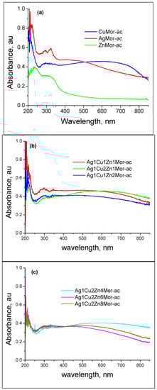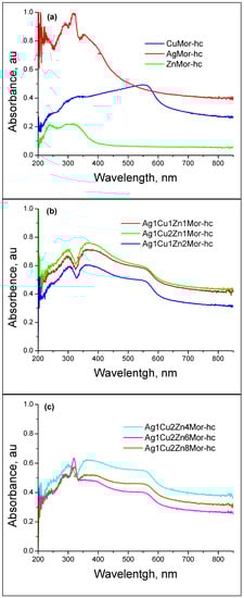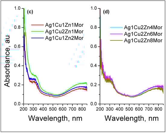 The UV-Vis spectra of the hc and ac samples are shown in Figure 7 and Figure 8, respectively. The UV-Vis spectra of all the trimetallic hc samples show a broad optical absorption with asymmetric peaks at 280–323 nm and ~400 nm, which is in line with a band at 550 nm. This last band is due to the plasma resonance of nanometer-sized colloidal copper particles, which is also present in the CuMor-hc monometallic sample. The absorption at 280–325 nm and ~400 nm is related to silver; the latter peak refers to the surface plasmon resonance of silver nanoparticles. These results are consistent with those obtained by XRD for the formation of copper and silver metals by hydrogen reduction and are consistent with previous studies [,,,,]. The absorption peaks in the 280–325 nm range are associated with silver clusters, which agrees with the data reported in [,,,,,]. In the case of AgMor-hc, peaks centered at 290 nm and 320 nm are observed. The latter peak is assigned to a neutral Ag8 cluster [,,,,], while the peak at 290 nm has been linked to positively charged clusters of different nuclearities, Agnδ+ (n < 10) [,]. For the Ag1Cu2Zn6Mor-hc and Ag1Cu2Zn8Mor-hc samples, which have a low silver content (see Table 1), the absorption peaks of the silver species have a low intensity; however, in their spectra, there is a band at 320 nm associated with neutral Ag8 clusters [,,,], which was not observed in other trimetallic samples. The results indicate a reduction of the Cu2+ and Ag+ cations under the applied conditions. In addition, this observation shows that, in the trimetallic samples, the formation of the Ag8 clusters correlates with a lower silver content (see Table 1), while the formation of the reduced silver species of larger sizes takes place in the trimetallic samples with higher silver content.