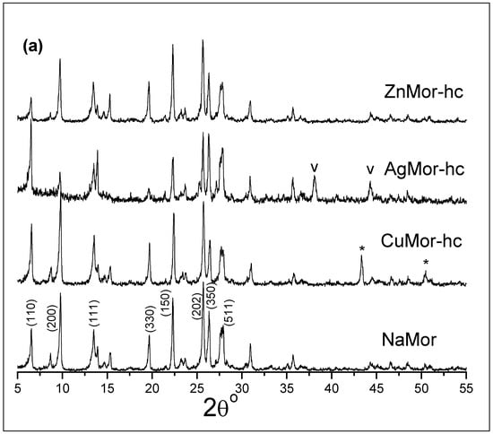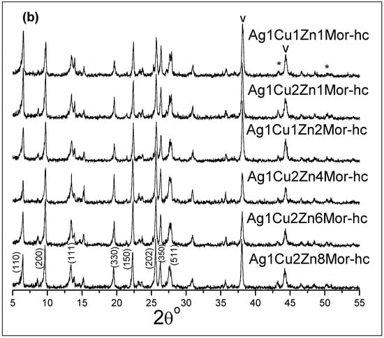 The X-ray diffraction patterns of the samples reduced and cooled in hydrogen (labeled as -hc) are shown in Figure 4. In the patterns of all the reduced trimetallic samples, new intense peaks at 38.11° and 44.29°, which correspond to metallic silver, are visible, which is in line with peaks at 43.2° and 50.3°, corresponding to metallic copper. The monometallic CuMor-hc and AgMor-hc samples also show these peaks for copper and silver, respectively. The results indicate that the reduction of the Cu2+ and Ag+ cations by H2 under the applied conditions and the subsequent agglomeration of the neutral atoms results in copper and silver metal particle formation. Note that the intensity of the (200) peak increases in the AgMor-hc and trimetallic samples (reduced and cooled in hydrogen), when compared to the same unreduced exchanged samples (Figure 3). This was associated with the absence of the Ag+ ions in the reduced samples that contain silver (Figure 4). It is opportune to remember that the (200) peak intensity in these exchanged samples (Figure 3) was low, and such intensity decreases with increasing silver content.