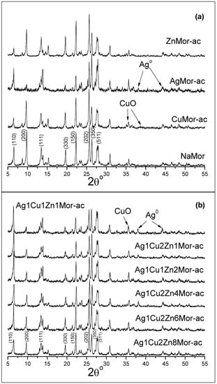 Synthetic Na-mordenite (NaMor) with a SiO2/Al2O3 molar ratio equal to 13 was supplied by Zeolyst International. Starting material was exchanged under microwave-radiation action with 0.5 N solutions of AgNO3, Cu(NO3)2, Zn(NO3)2, and their mixtures, using a Synthos 300 Anton Paar oven (Media, PA, USA)equipped with a microwave reaction system. All used salts (AgNO3, Cu(NO3)2, and Zn(NO3)2) were reactive grade; they were supplied by Sigma-Aldrich, St. Louis, MO, USA. The mixed solutions used to obtain the ternary samples were prepared by mixing of AgNO3, Cu(NO3)2, and Zn(NO3)2 solutions in 1:1:1, 1:1:2, 1:2:1, 1:2:4, 1:2:6, and 1:2:8 ratios, respectively. The different ratios were established to obtain samples with diverse Cu, Zn, and Ag contents; it was made taking into account the ion exchange capacity of this mordenite and the knowledge that most of zeolites have higher selectivity by Ag+ cations []. These relationships were used for the further labeling of trimetallic samples as the numbers after symbol of each metal. Solid/solution ratio was maintained, equal to 1 g/10 mL. The exchange was performed at a 100 °C constant temperature during 120 min with a ramp 15 °C/min.